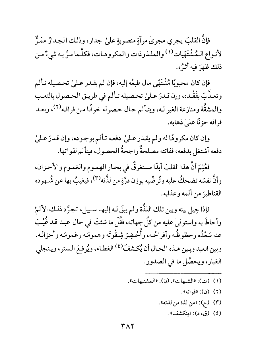 فإنَّ القلبَ يجري مجرى مرآةٍ منصوبةٍ على جدار، وذلك الجدارُ مَمرٌّ لأنواع المُشْتَهَيات (¬١) والملذوذات والمكروهات، فكلَّما مرَّ به شيءٌ من ذلك ظهرَ فيه أثرُه.