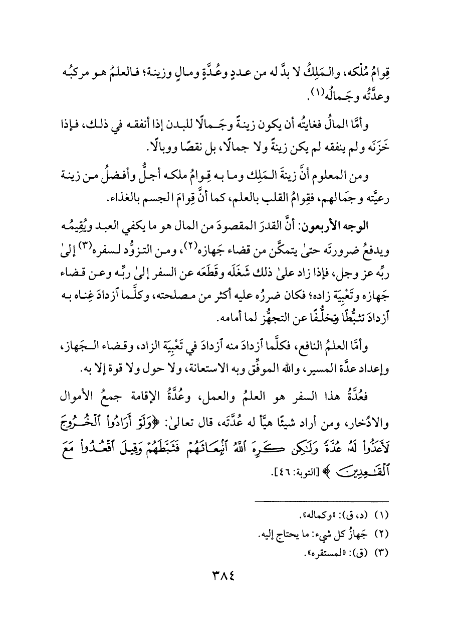 ومن المعلوم أنَّ زينةَ المَلِك وما به قِوامُ ملكه أجلُّ وأفضلُ من زينة رعيَّته وجَمالهم، فقِوامُ القلب بالعلم، كما أنَّ قِوامَ الجسم بالغذاء.