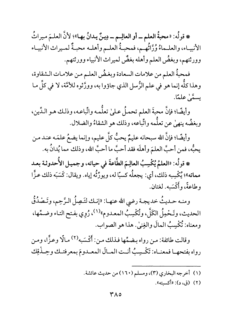 * قولُه: «محبةُ العلم ــ أو العالِم ــ دِينٌ يدانُ بها»؛ لأنَّ العلمَ ميراثُ الأنبياء، والعلماءُ وُرَّاثُهم، فمحبةُ العلم وأهله محبةٌ لميراث الأنبياء وورثتهم، وبغضُ العلم وأهله بغضٌ لميراث الأنبياء وورثتهم.