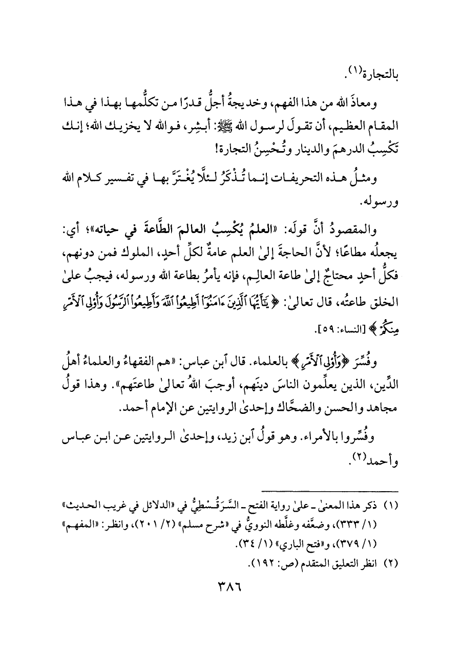 وفُسِّرَ {وَأُولِي الْأَمْرِ} بالعلماء. قال ابن عباس: «هم الفقهاءُ والعلماءُ أهلُ الدِّين، الذين يعلِّمون الناسَ دينَهم، أوجبَ اللهُ تعالى طاعتَهم». وهذا قولُ مجاهد والحسن والضحَّاك وإحدى الروايتين عن الإمام أحمد.