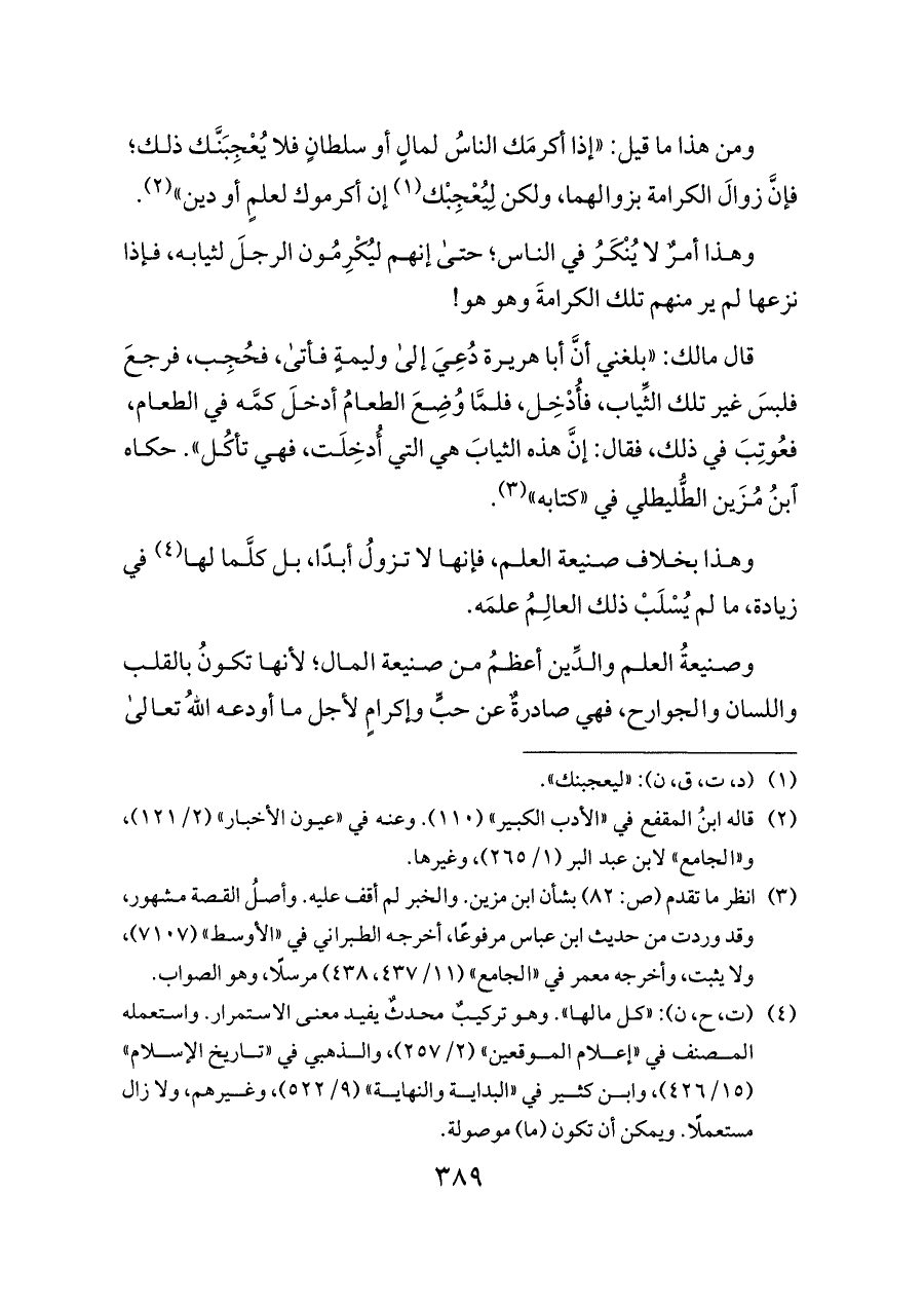 ومن هذا ما قيل: «إذا أكرمَك الناسُ لمالٍ أو سلطانٍ فلا يُعْجِبَنَّك ذلك؛ فإنَّ زوالَ الكرامة بزوالهما، ولكن لِيُعْجِبْك (¬١) إن أكرموك لعلمٍ أو دين» (¬٢).