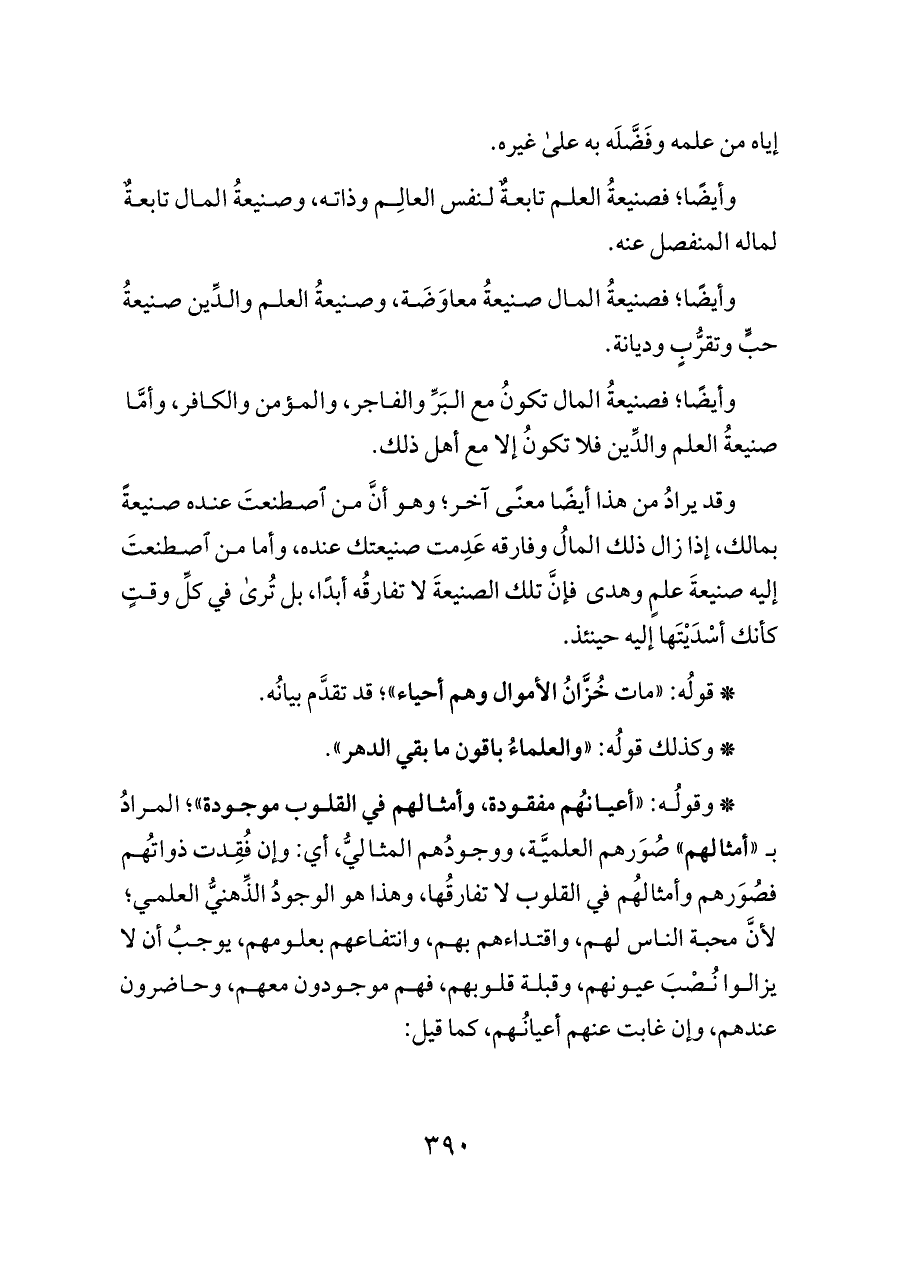 وأيضًا؛ فصنيعةُ العلم تابعةٌ لنفس العالِم وذاته، وصنيعةُ المال تابعةٌ لماله المنفصل عنه.