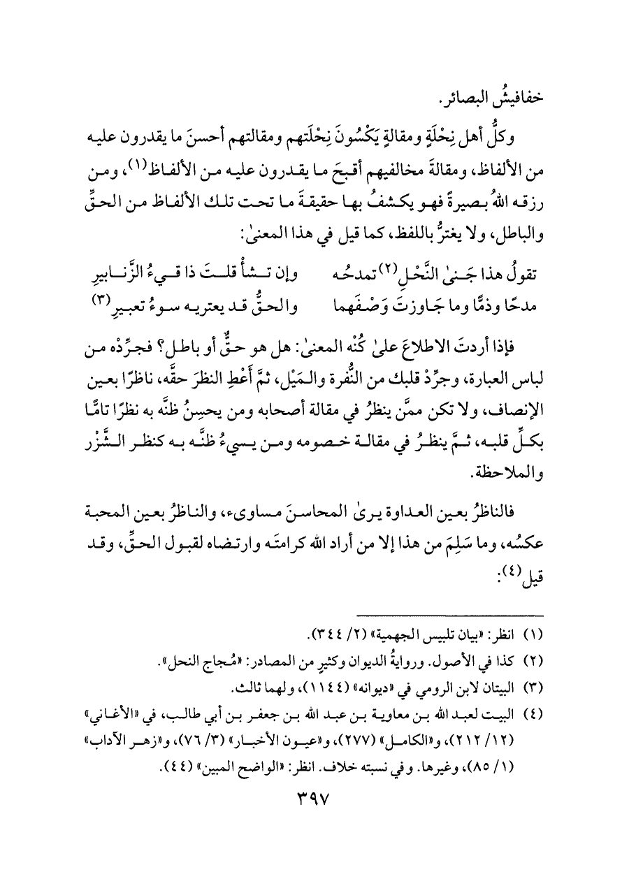 فالناظرُ بعين العداوة يرى المحاسنَ مساواء، والناظرُ بعين المحبة عكسُه، وما سَلِمَ من هذا إلا من أراد الله كرامتَه وارتضاه لقبول الحقِّ، وقد قيل (¬٤):