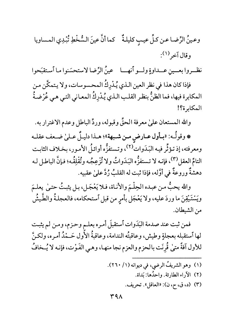 * وقولُه: «بأول عارضٍ من شبهة»؛ هذا دليلٌ على ضعف عقله ومعرفته، إذ تؤثِّر فيه البَدَوات (¬٢)، وتستفزُّه أوائلُ الأمور، بخلاف الثابت التامِّ العقل (¬٣)، فإنه لا تستفزُّه البَدَواتُ ولا تُزْعِجُه وتُقْلِقُه؛ فإنَّ الباطل له دهشةٌ وروعةٌ في أوَّله، فإذا ثبت له القلبُ رُدَّ على عقبيه.
