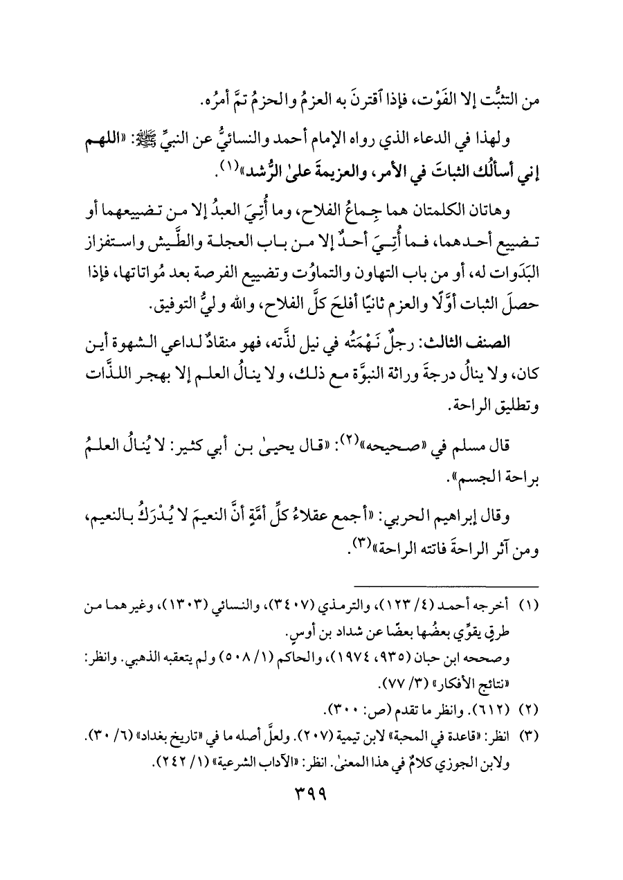 وهاتان الكلمتان هما جِماعُ الفلاح، وما أُتِيَ العبدُ إلا من تضييعهما أو تضييع أحدهما، فما أُتِيَ أحدٌ إلا من باب العجلة والطَّيش واستفزاز البَدَوات له، أو من باب التهاون والتماوُت وتضييع الفرصة بعد مُواتاتها، فإذا حصلَ الثبات أوَّلًا والعزم ثانيًا أفلحَ كلَّ الفلاح، والله وليُّ التوفيق.