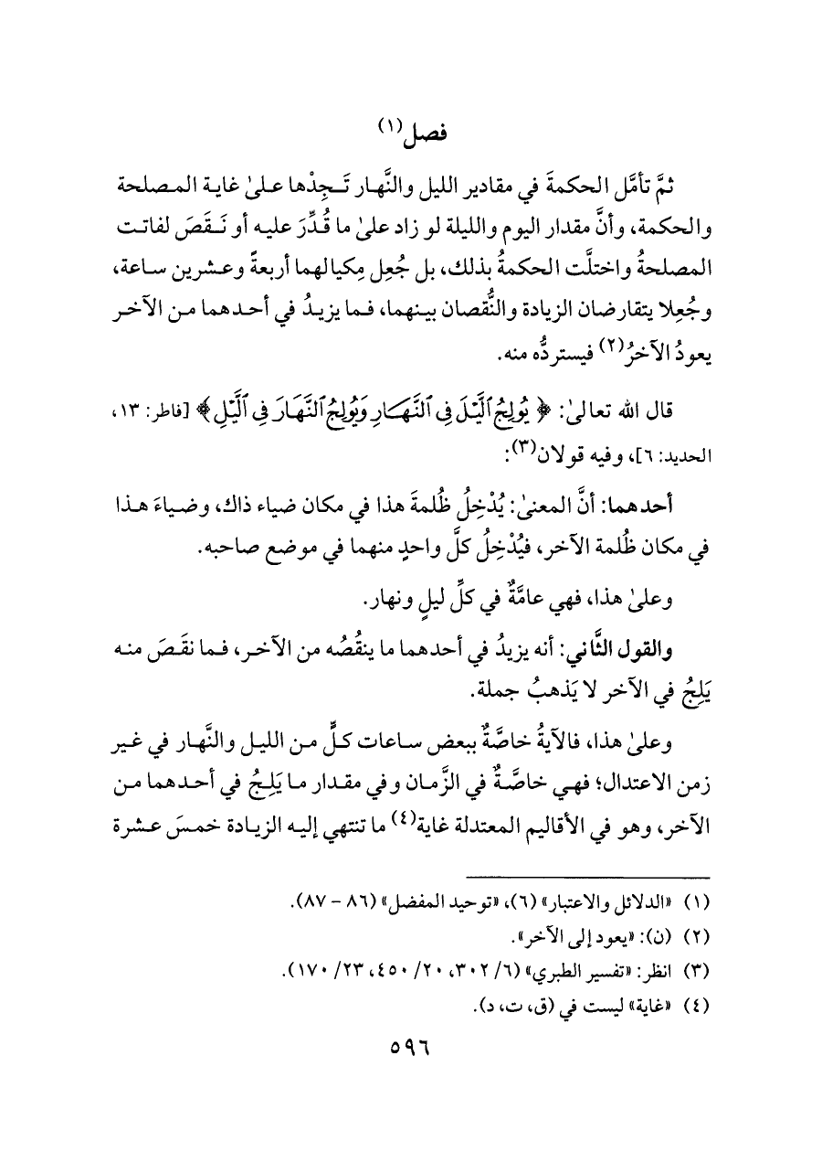 قال الله تعالى: {يُولِجُ اللَّيْلَ فِي النَّهَارِ وَيُولِجُ النَّهَارَ فِي اللَّيْلِ} [فاطر: ١٣، الحديد: ٦]، وفيه قولان (¬٣):