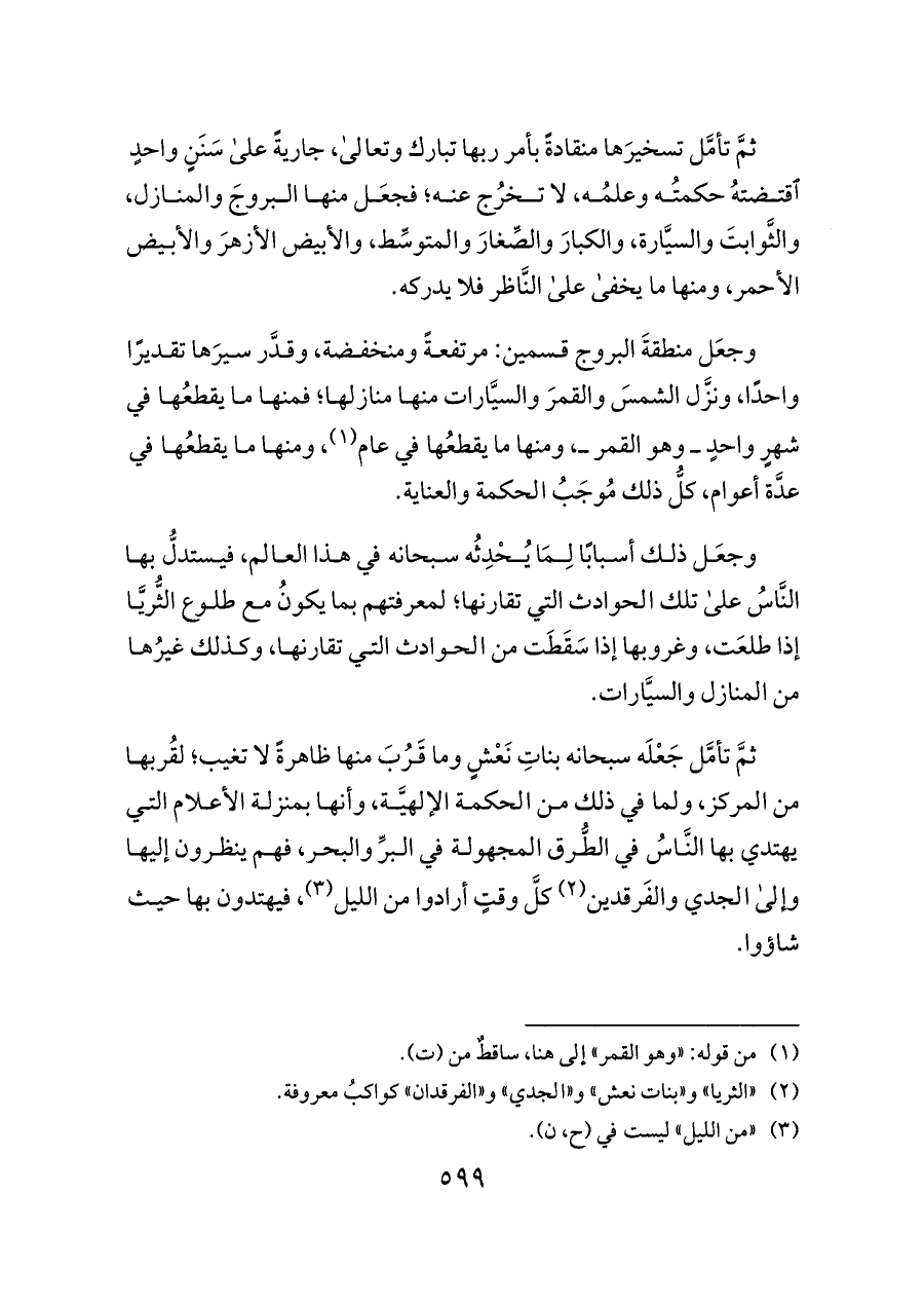 وجعَل منطقةَ البروج قسمين: مرتفعةً ومنخفضة، وقدَّر سيرَها تقديرًا واحدًا، ونزَّل الشمسَ والقمرَ والسيَّارات منها منازلها؛ فمنها ما يقطعُها في شهرٍ واحدٍ ــ وهو القمر ــ، ومنها ما يقطعُها في عام (¬١)، ومنها ما يقطعُها في عدَّة أعوام، كلُّ ذلك مُوجَبُ الحكمة والعناية.