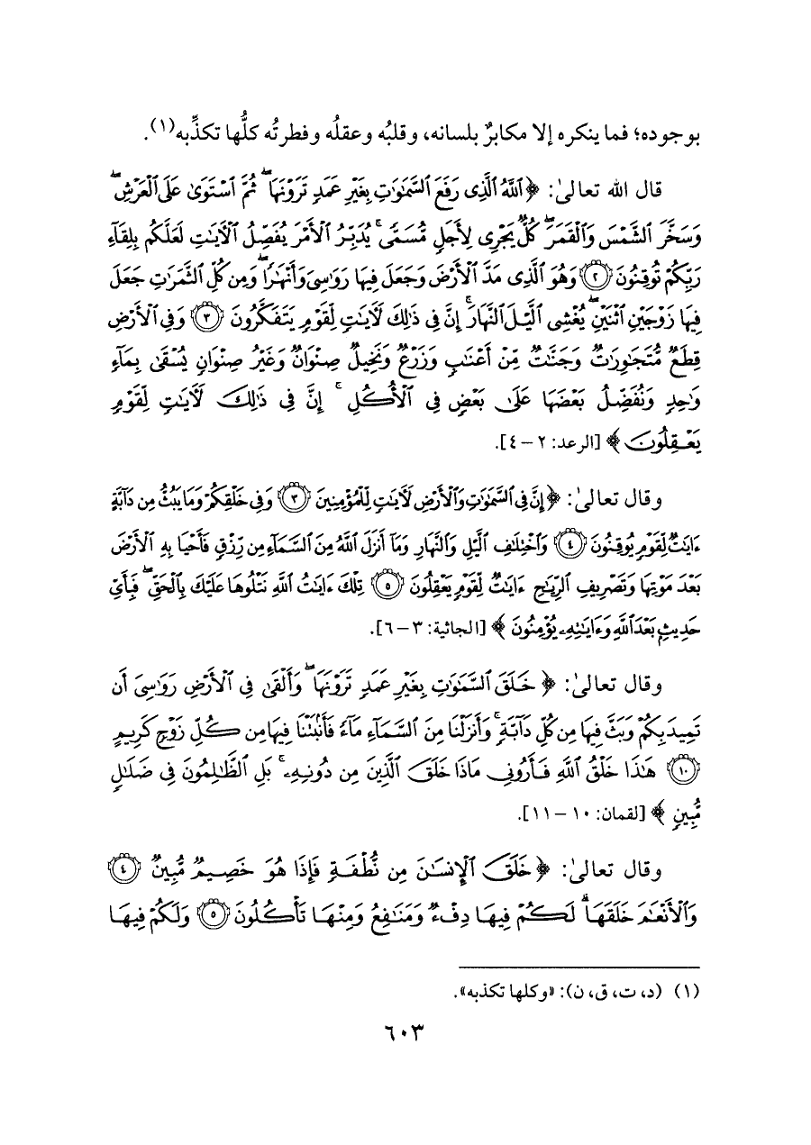 بوجوده؛ فما ينكره إلا مكابرٌ بلسانه، وقلبُه وعقلُه وفطرتُه كلُّها تكذِّبه (¬١).