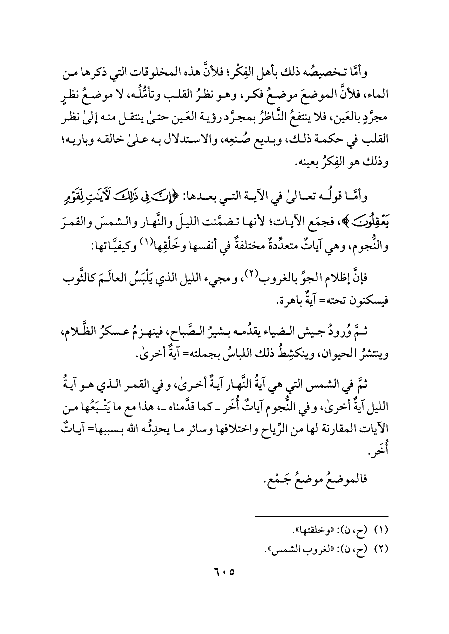 وأمَّا تخصيصُه ذلك بأهل الفِكْر؛ فلأنَّ هذه المخلوقات التي ذكرها من الماء، فلأنَّ الموضعَ موضعُ فكر، وهو نظرُ القلب وتأمُّلُه، لا موضعُ نظرٍ مجرَّدٍ بالعَين، فلا ينتفعُ النَّاظرُ بمجرَّد رؤية العَين حتى ينتقل منه إلى نظر القلب في حكمة ذلك، وبديع صُنعِه، والاستدلال به على خالقه وباريه؛ وذلك هو الفِكرُ بعينه.