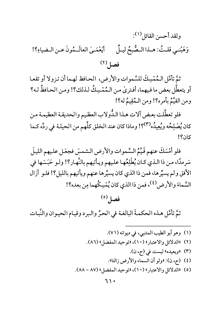 (¬٥) «الدلائل والاعتبار» (١٠)، «توحيد المفضل» (٨٧ - ٨٨).