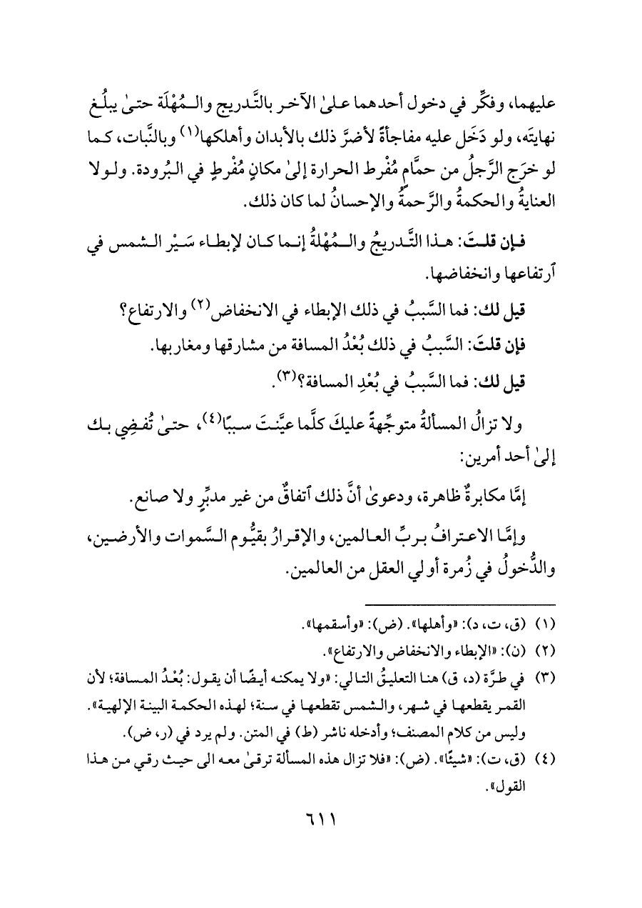 (¬٣) في طرَّة (د، ق) هنا التعليقُ التالي: «ولا يمكنه أيضًا أن يقول: بُعْدُ المسافة؛ لأن القمر يقطعها في شهر، والشمس تقطعها في سنة؛ لهذه الحكمة البينة الإلهية». وليس من كلام المصنف؛ وأدخله ناشر (ط) في المتن. ولم يرد في (ر، ض).
