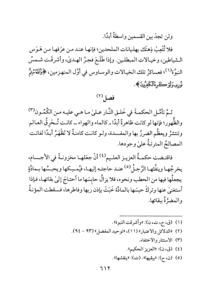 فلا تُتْعِبْ ذِهنَك بهذيانات الملحدين؛ فإنها عند من عرَفها من هَوَس الشياطين، وخيالات المبطلين. وإذا طَلَعَ فجرُ الهدى، وأشرقَت شمسُ النبوَّة (¬١)؛ فعساكرُ تلك الخيالات والوساوس في أوَّل المنهزمين، {وَاللَّهُ مُتِمُّ نُورِهِ وَلَوْ كَرِهَ الْكَافِرُونَ}.