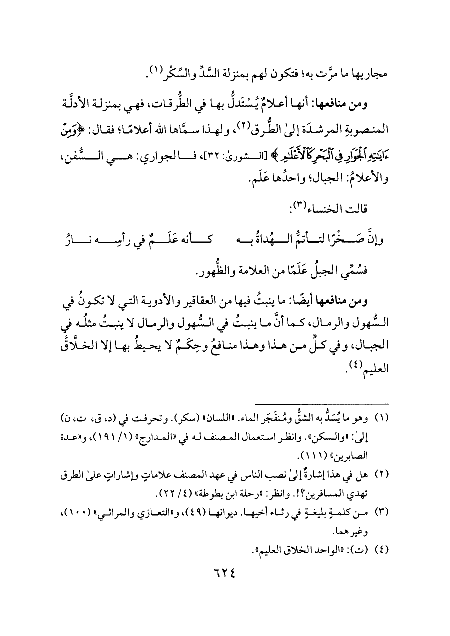 ومن منافعها: أنها أعلامٌ يُسْتَدلُّ بها في الطُّرقات، فهي بمنزلة الأدلَّة المنصوبةِ المرشدَة إلى الطُّرق (¬٢)، ولهذا سمَّاها الله أعلامًا؛ فقال: {وَمِنْ آيَاتِهِ الْجَوَارِ فِي الْبَحْرِ كَالْأَعْلَامِ} [الشورى: ٣٢]، فالجواري: هي السُّفن، والأعلامُ: الجبال؛ واحدُها عَلَم.