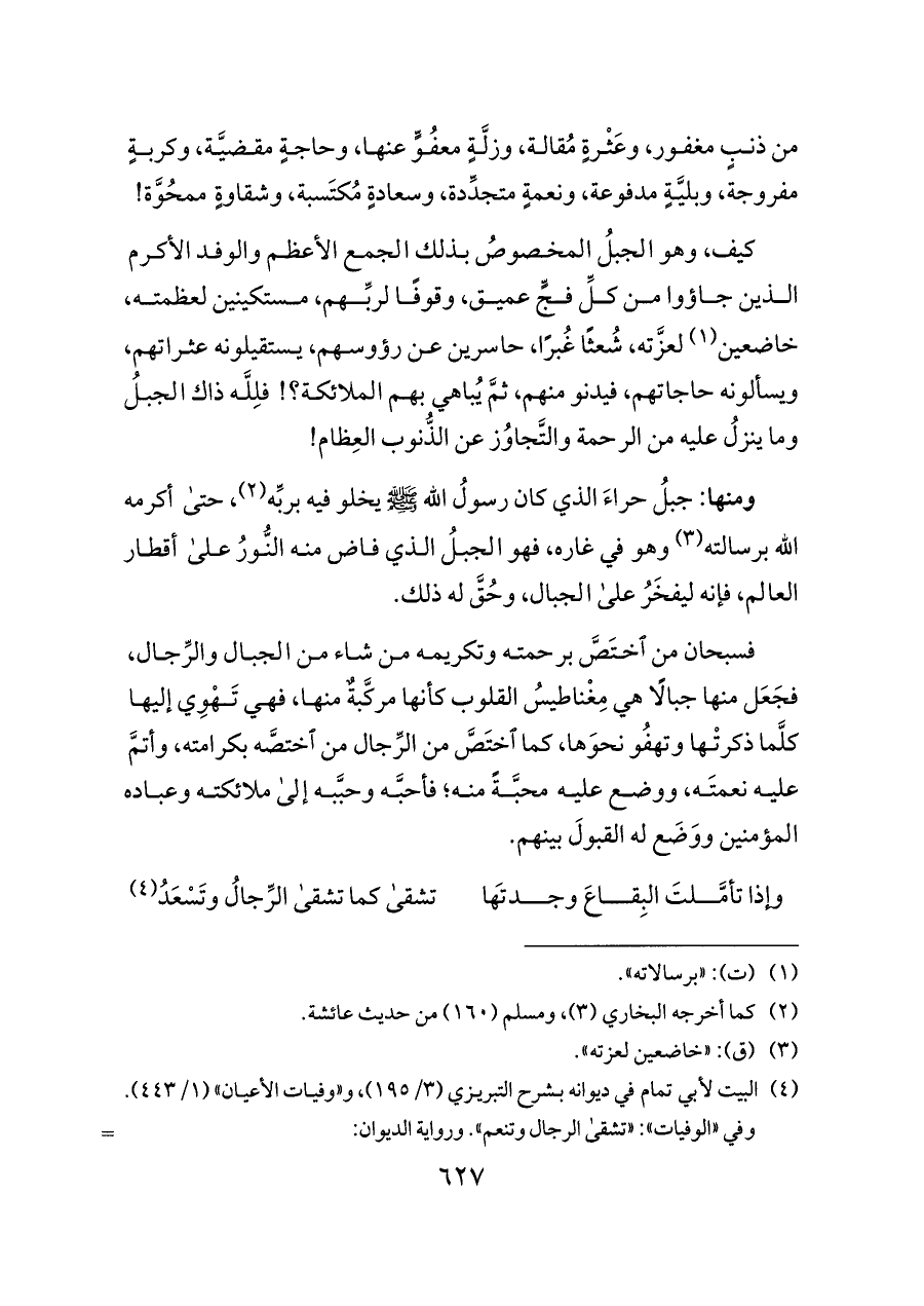 فسبحان من اختَصَّ برحمته وتكريمه من شاء من الجبال والرِّجال، فجَعَل منها جبالًا هي مِغْناطيسُ القلوب كأنها مركَّبةٌ منها، فهي تَهْوِي إليها كلَّما ذكرتْها وتهفُو نحوَها، كما اختَصَّ من الرِّجال من اختصَّه بكرامته، وأتمَّ عليه نعمتَه، ووضع عليه محبَّةً منه؛ فأحبَّه وحبَّبه إلى ملائكته وعباده المؤمنين ووَضَع له القبولَ بينهم.