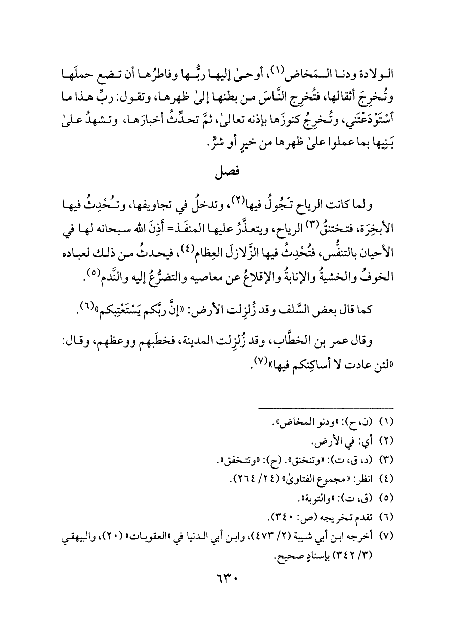 ولما كانت الرياح تَجُولُ فيها (¬٢)، وتدخلُ في تجاويفها، وتُحْدِثُ فيها الأبخِرَة، فتختنقُ (¬٣) الرياح، ويتعذَّرُ عليها المنفَذ= أَذِنَ الله سبحانه لها في الأحيان بالتنفُّس، فتُحْدِثُ فيها الزَّلازلَ العِظام (¬٤)، فيحدثُ من ذلك لعباده الخوفُ والخشيةُ والإنابةُ والإقلاعُ عن معاصيه والتضرُّعُ إليه والنَّدم (¬٥).