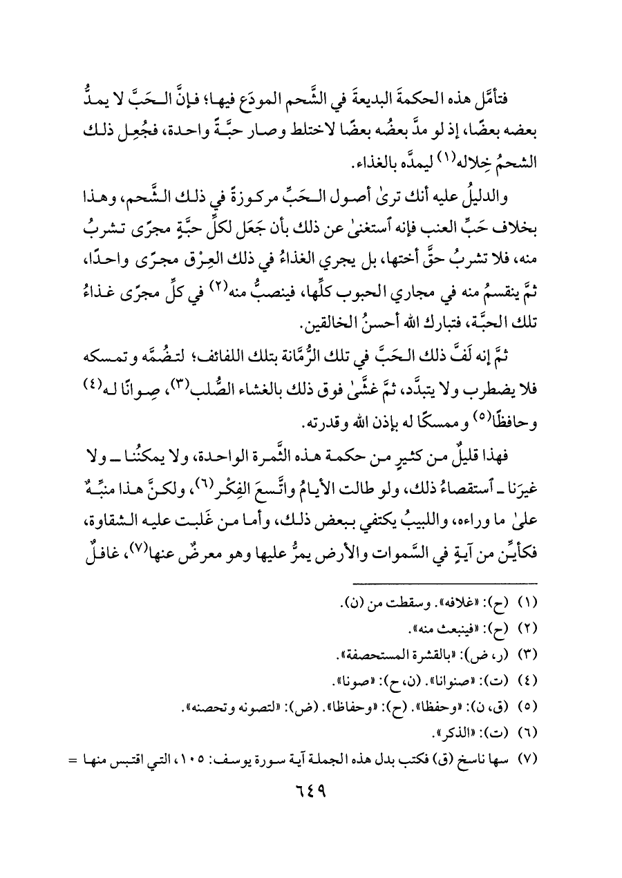 والدليلُ عليه أنك ترى أصول الحَبِّ مركوزةً في ذلك الشَّحم، وهذا بخلاف حَبِّ العنب فإنه استغنى عن ذلك بأن جَعَل لكلِّ حبَّةٍ مجرًى تشربُ منه، فلا تشربُ حقَّ أختها، بل يجري الغذاءُ في ذلك العِرْق مجرًى واحدًا، ثمَّ ينقسمُ منه في مجاري الحبوب كلِّها، فينصبُّ منه (¬٢) في كلِّ مجرًى غذاءُ تلك الحبَّة، فتبارك الله أحسنُ الخالقين.