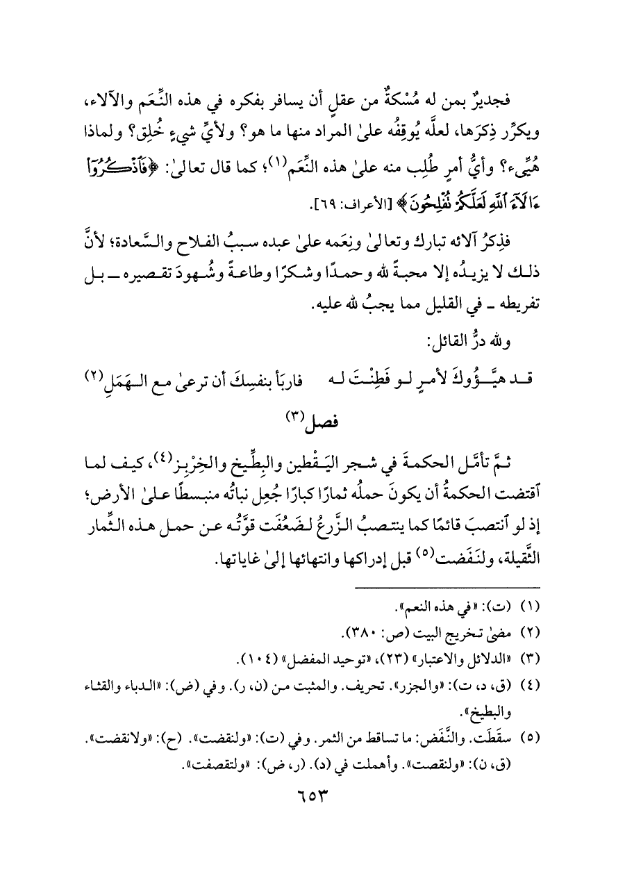 ثمَّ تأمَّل الحكمةَ في شجر اليَقْطين والبِطِّيخ والخِرْبِز (¬٤)، كيف لما اقتضت الحكمةُ أن يكونَ حملُه ثمارًا كبارًا جُعِل نباتُه منبسطًا على الأرض؛ إذ لو انتصبَ قائمًا كما ينتصبُ الزَّرعُ لضَعُفَت قوَّتُه عن حمل هذه الثِّمار الثَّقيلة، ولنَفَضت (¬٥) قبل إدراكها وانتهائها إلى غاياتها.