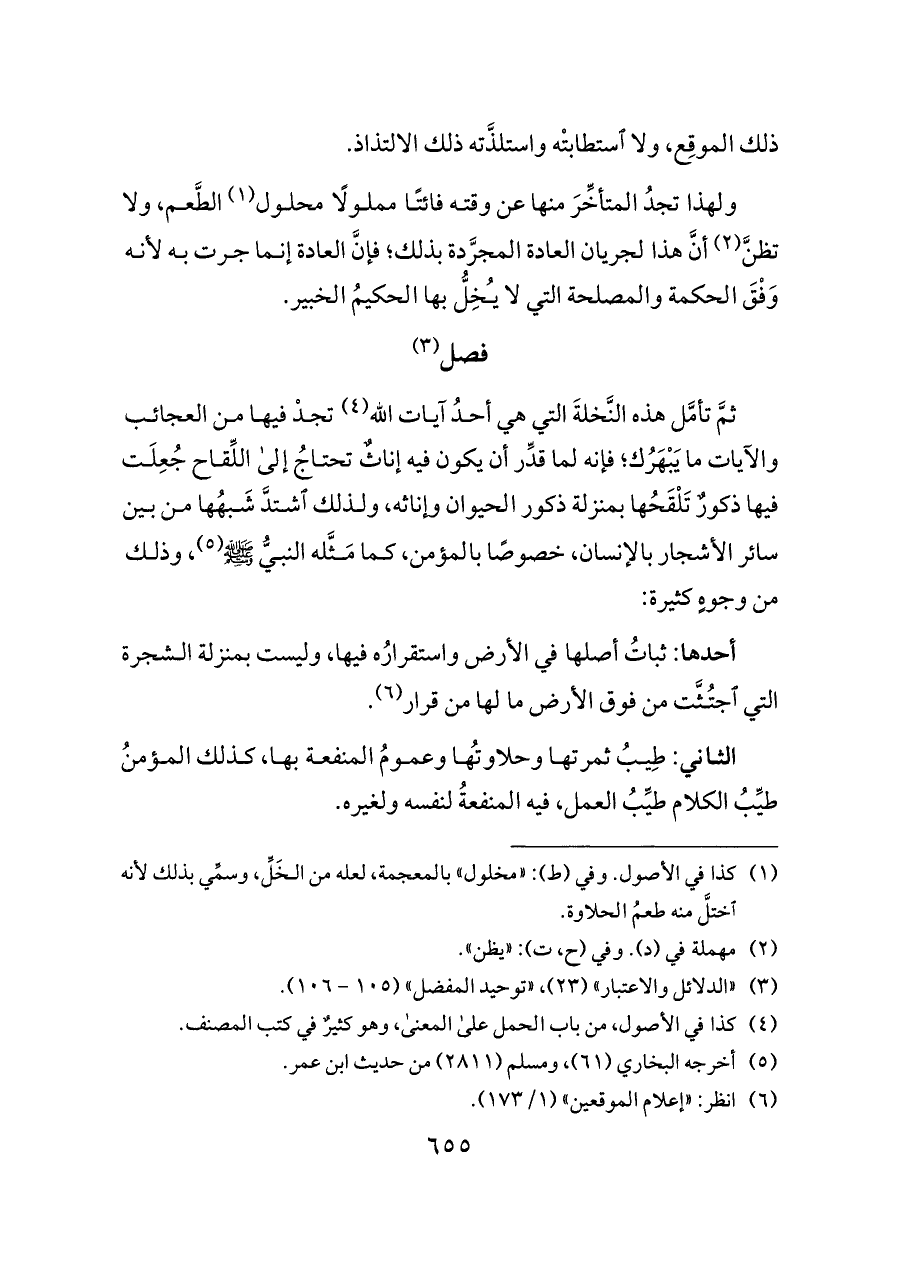 ثمَّ تأمَّل هذه النَّخلةَ التي هي أحدُ آيات الله (¬٤) تجدْ فيها من العجائب والآيات ما يَبْهَرُك؛ فإنه لما قدِّر أن يكون فيه إناثٌ تحتاجُ إلى اللِّقاح جُعِلَت فيها ذكورٌ تَلْقَحُها بمنزلة ذكور الحيوان وإناثه، ولذلك اشتدَّ شَبهُها من بين سائر الأشجار بالإنسان، خصوصًا بالمؤمن، كما مَثَّله النبيُّ - صلى الله عليه وسلم - (¬٥)، وذلك من وجوهٍ كثيرة: