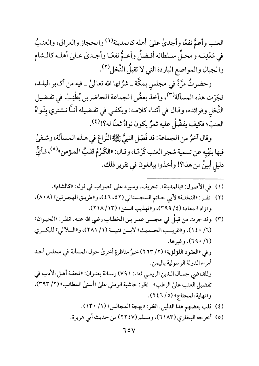 وحضرتُ مرَّةً في مجلسٍ بمكَّة ــ شرَّفها الله تعالى ــ فيه من أكابر البلد، فجَرَت هذه المسألة (¬٣)، وأخذ بعضُ الجماعة الحاضرين يُطْنِبُ في تفضيل النَّخلِ وفوائده، وقال في أثناء كلامه: ويكفي في تفضيله أنَّا نشتري بِنَواهُ العنبَ؛ فكيف يفضَّلُ عليه ثمرٌ يكون نواهُ ثمنًا له؟! (¬٤).