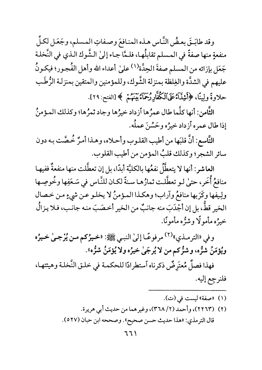 وقد طابَقَ بعضُ النَّاس هذه المنافعَ وصفاتِ المسلم، وجَعَل لكلِّ منفعةٍ منها صفةً في المسلم تقابلُها، فلمَّا جاء إلى الشَّوك الذي في النَّخلة جَعَل بإزائه من المسلم صفةَ الحِدَّة (¬١) على أعداء الله وأهل الفُجور؛ فيكونُ عليهم في الشدَّة والغِلظة بمنزلة الشَّوك، وللمؤمنين والمتقين بمنزلة الرُّطَب حلاوةً ولِينًا، {أَشِدَّاءُ عَلَى الْكُفَّارِ رُحَمَاءُ بَيْنَهُمْ} [الفتح: ٢٩].