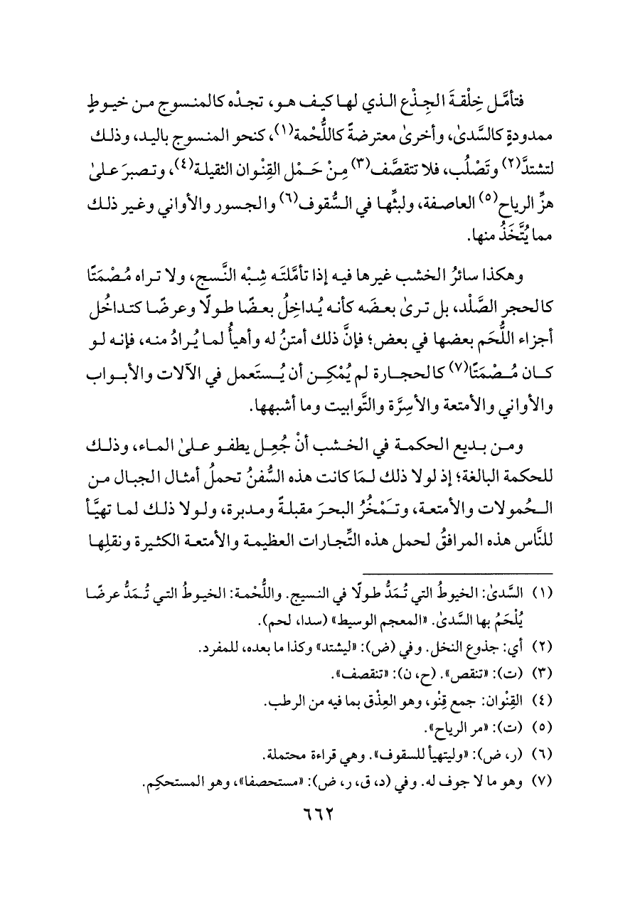 فتأمَّل خِلْقةَ الجِذْع الذي لها كيف هو، تجدْه كالمنسوج من خيوطٍ ممدودةٍ كالسَّدى، وأخرى معترضةً كاللُّحْمة (¬١)، كنحو المنسوج باليد، وذلك لتشتدَّ (¬٢) وتَصْلُب، فلا تتقصَّف (¬٣) مِنْ حَمْل القِنْوان الثقيلة (¬٤)، وتصبرَ على هزِّ الرياح (¬٥) العاصفة، ولبثِّها في السُّقوف (¬٦) والجسور والأواني وغير ذلك مما يُتَّخَذُ منها.