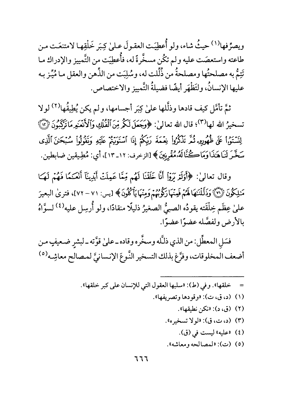 ثمَّ تأمَّل كيف قادها وذلَّلها على كِبَر أجسامها، ولم يكن يُطِيقُها (¬٢) لولا تسخيرُ الله لها (¬٣)؛ قال الله تعالى: {وَجَعَلَ لَكُمْ مِنَ الْفُلْكِ وَالْأَنْعَامِ مَا تَرْكَبُونَ (١٢) لِتَسْتَوُوا عَلَى ظُهُورِهِ ثُمَّ تَذْكُرُوا نِعْمَةَ رَبِّكُمْ إِذَا اسْتَوَيْتُمْ عَلَيْهِ وَتَقُولُوا سُبْحَانَ الَّذِي سَخَّرَ لَنَا هَذَا وَمَا كُنَّا لَهُ مُقْرِنِينَ} [الزخرف: ١٢ ــ ١٣]، أي: مُطِيقين ضابطين.