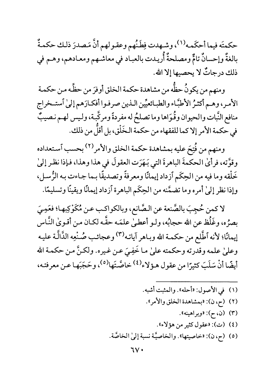 ومنهم من يكونُ حظُّه من مشاهدة حكمة الخلق أوفرَ من حظِّه من حكمة الأمر، وهم أكثرُ الأطبَّاء والطبائعيِّين الذين صرفوا أفكارَهم إلى استخراج منافع النَّبات والحيوان وقُوَاها وما تصلحُ له مفردةً ومركَّبة، وليس لهم نصيبٌ في حكمة الأمر إلا كما للفقهاء من حكمة الخَلْق، بل أقلُّ من ذلك.