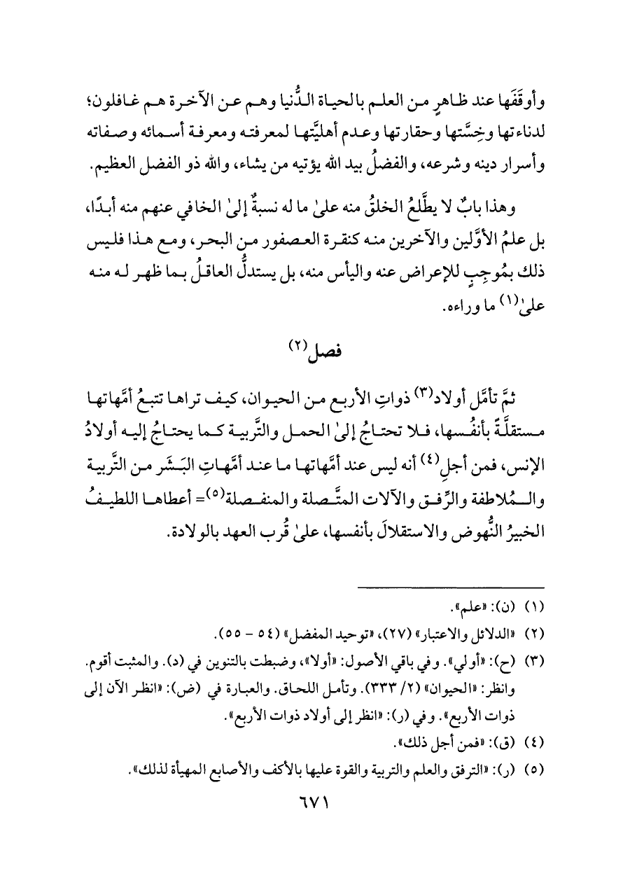 (¬٢) «الدلائل والاعتبار» (٢٧)، «توحيد المفضل» (٥٤ - ٥٥).