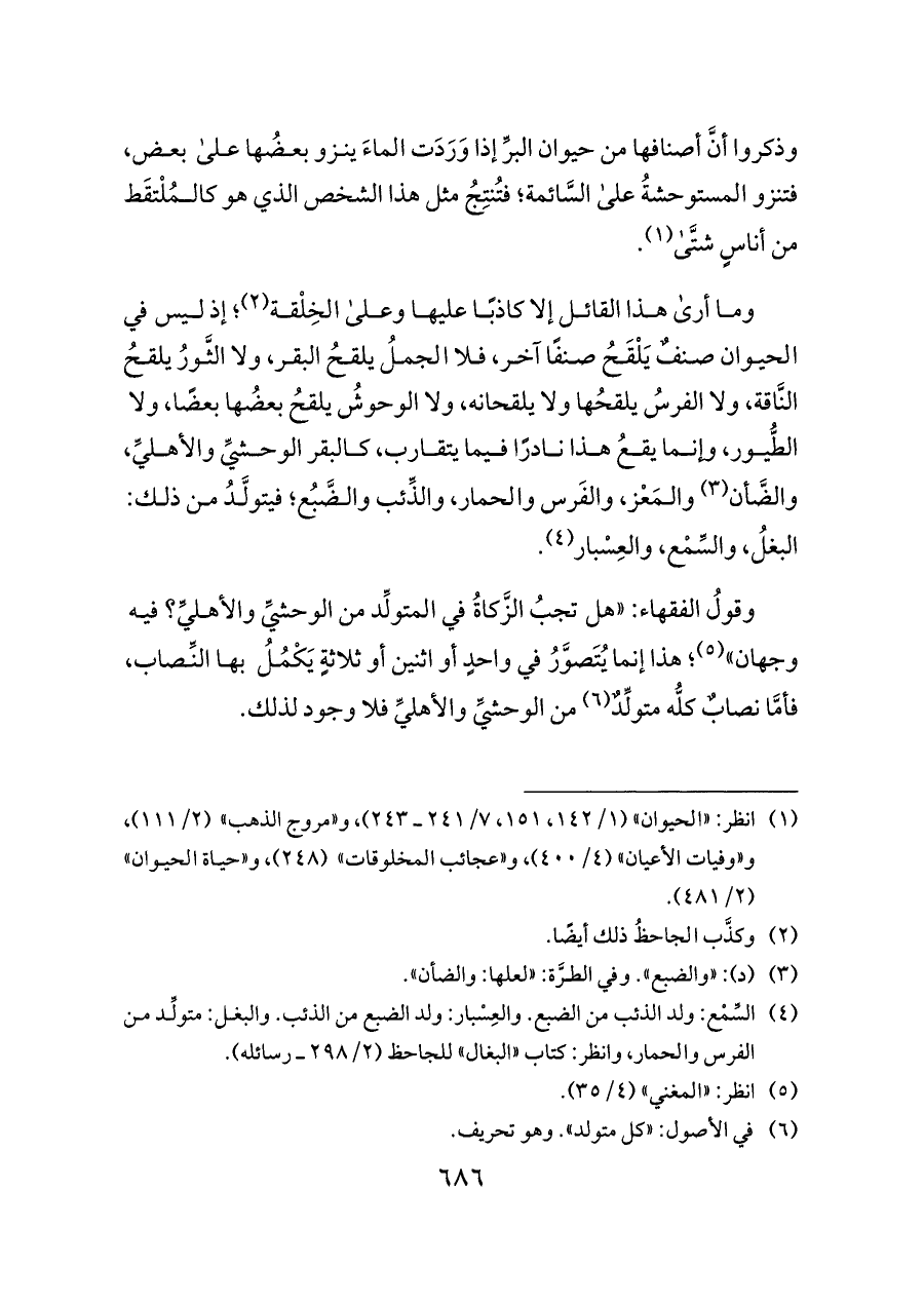 وقولُ الفقهاء: «هل تجبُ الزَّكاةُ في المتولِّد من الوحشيِّ والأهليِّ؟ فيه وجهان» (¬٥)؛ هذا إنما يُتَصوَّرُ في واحدٍ أو اثنين أو ثلاثةٍ يَكْمُلُ بها النِّصاب، فأمَّا نصابٌ كلُّه متولِّدٌ (¬٦) من الوحشيِّ والأهليِّ فلا وجود لذلك.