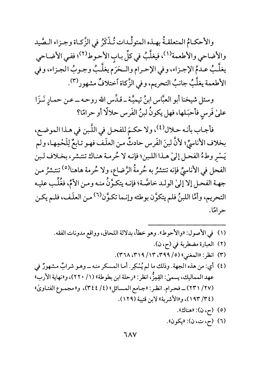 وسئل شيخنا أبو العبَّاس ابنُ تيميَّة ــ قدَّس الله روحه ــ عن حمارٍ نَزَا على فَرسٍ فأحبَلها، فهل يكونُ لبنُ الفَرس حلالًا أو حرامًا؟