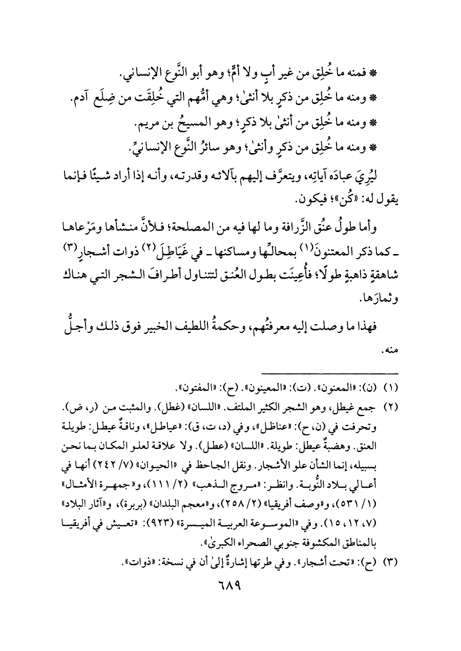 وأما طولُ عنُق الزَّرافة وما لها فيه من المصلحة؛ فلأنَّ منشأها ومَرْعاها ــ كما ذكر المعتنونَ (¬١) بمحالِّها ومساكنها ــ في غَيَاطِلَ (¬٢) ذوات أشجارٍ (¬٣) شاهقةٍ ذاهبةٍ طولًا؛ فأُعِينَت بطول العُنق لتتناول أطرافَ الشجر التي هناك وثمارَها.