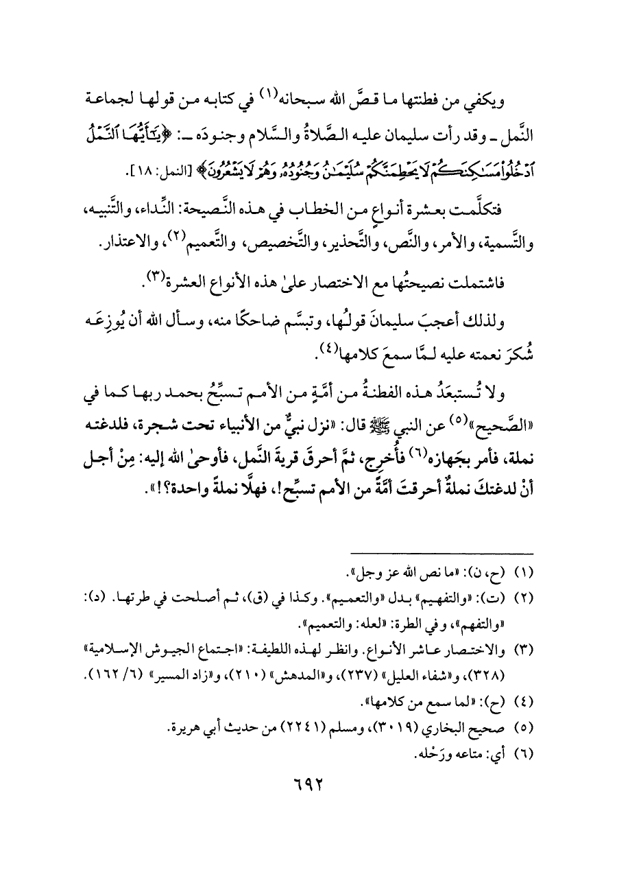 ولا تُستبعَدُ هذه الفطنةُ من أمَّةٍ من الأمم تسبِّحُ بحمد ربها كما في «الصَّحيح» (¬٥) عن النبي - صلى الله عليه وسلم - قال: «نزل نبيٌّ من الأنبياء تحت شجرة، فلدغته نملة، فأمر بجَهازه (¬٦) فأُخرِج، ثمَّ أحرقَ قريةَ النَّمل، فأوحى الله إليه: مِنْ أجل أنْ لدغتكَ نملةٌ أحرقتَ أمَّةً من الأمم تسبِّح!، فهلَّا نملةً واحدة؟!».