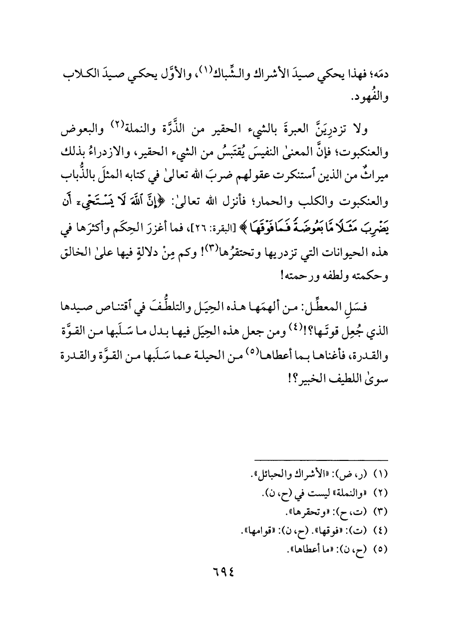 ولا تزدرِيَنَّ العبرةَ بالشيء الحقير من الذَّرَّة والنملة (¬٢) والبعوض والعنكبوت؛ فإنَّ المعنى النفيسَ يُقتَبسُ من الشيء الحقير، والازدراءُ بذلك ميراثٌ من الذين استنكرت عقولهم ضربَ الله تعالى في كتابه المثلَ بالذُّباب والعنكبوت والكلب والحمار؛ فأنزل الله تعالى: {إِنَّ اللَّهَ لَا يَسْتَحْيِي أَنْ يَضْرِبَ مَثَلًا مَا بَعُوضَةً فَمَا فَوْقَهَا} [البقرة: ٢٦]، فما أغزرَ الحِكَم وأكثرَها في هذه الحيوانات التي تزدريها وتحتقرُها (¬٣)! وكم مِنْ دلالةٍ فيها على الخالق وحكمته ولطفه ورحمته!