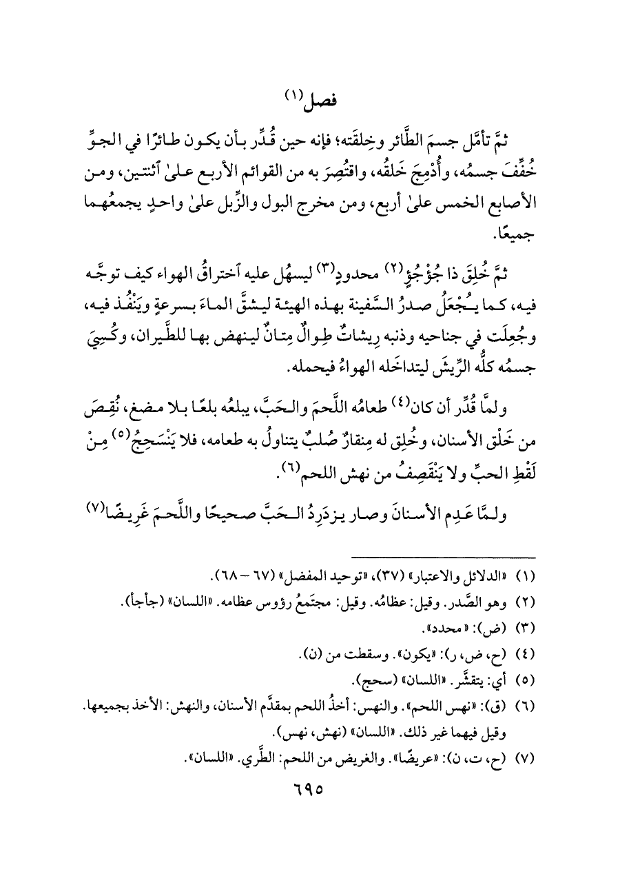 ثمَّ تأمَّل جسمَ الطَّائر وخِلقَته؛ فإنه حين قُدِّر بأن يكون طائرًا في الجوِّ خُفِّفَ جسمُه، وأُدْمِجَ خَلقُه، واقتُصِرَ به من القوائم الأربع على اثنتين، ومن الأصابع الخمس على أربع، ومن مخرج البول والزِّبل على واحدٍ يجمعُهما جميعًا.