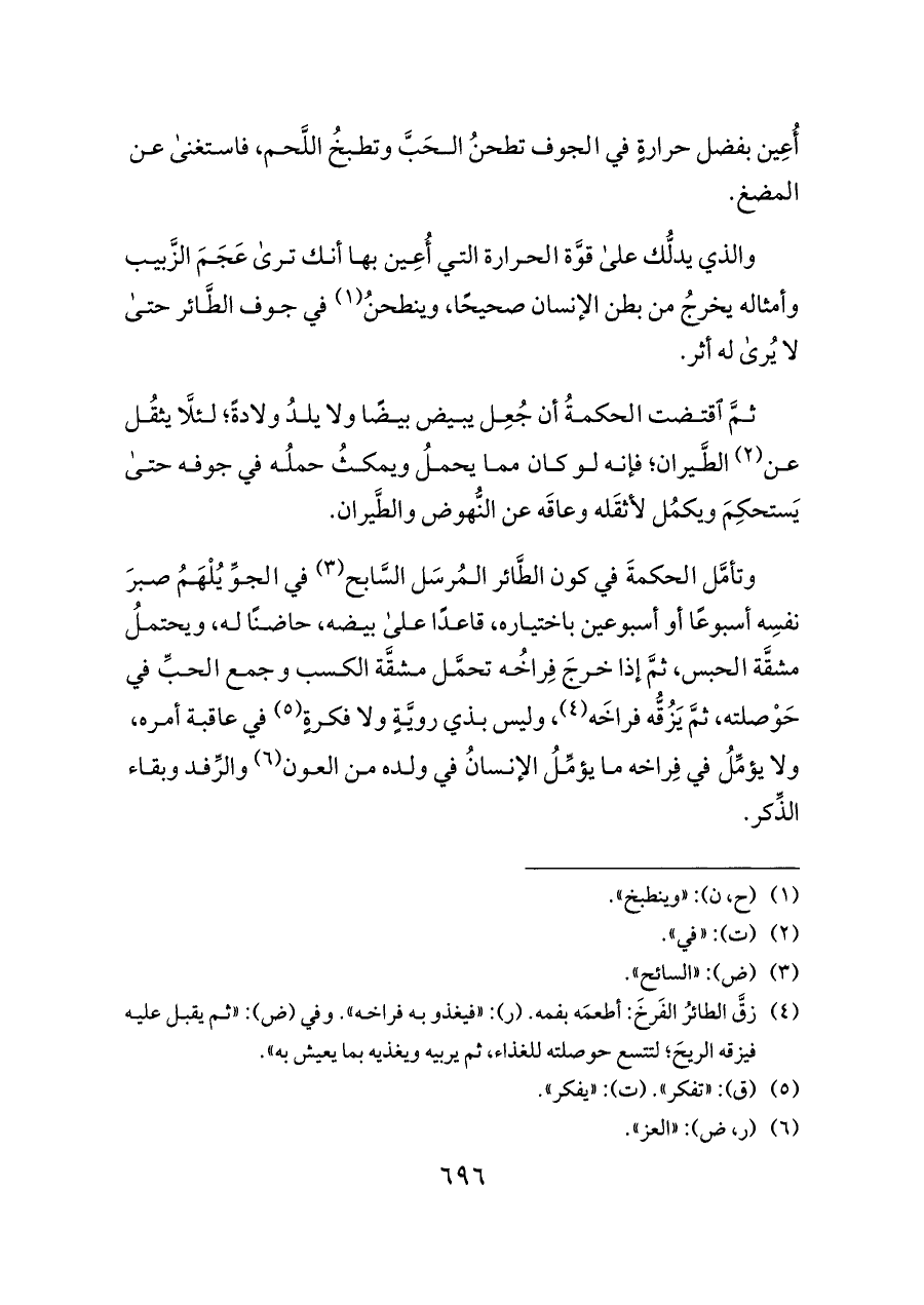 والذي يدلُّك على قوَّة الحرارة التي أُعِين بها أنك ترى عَجَمَ الزَّبيب وأمثاله يخرجُ من بطن الإنسان صحيحًا، وينطحنُ (¬١) في جوف الطَّائر حتى لا يُرى له أثر.