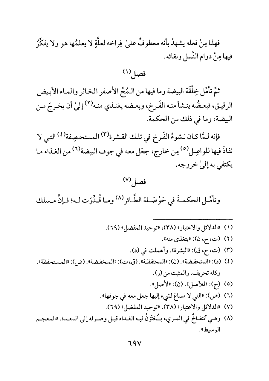 (¬١) «الدلائل والاعتبار» (٣٨)، «توحيد المفضل» (٦٩).