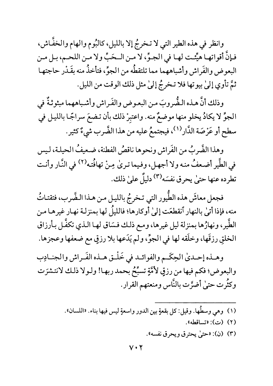 وانظر في هذه الطير التي لا تخرجُ إلا بالليل، كالبُوم والهام والخفَّاش، فإنَّ أقواتها هيِّئت لها في الجوِّ، لا من الحَبِّ ولا من اللحم، بل من البعوض والفَراش وأشباههما مما تلتقطُه من الجوِّ، فتأخذُ منه بقَدْر حاجتها ثمَّ تأوي إلى بيوتها فلا تخرجُ إلى مثل ذلك الوقت من الليل.