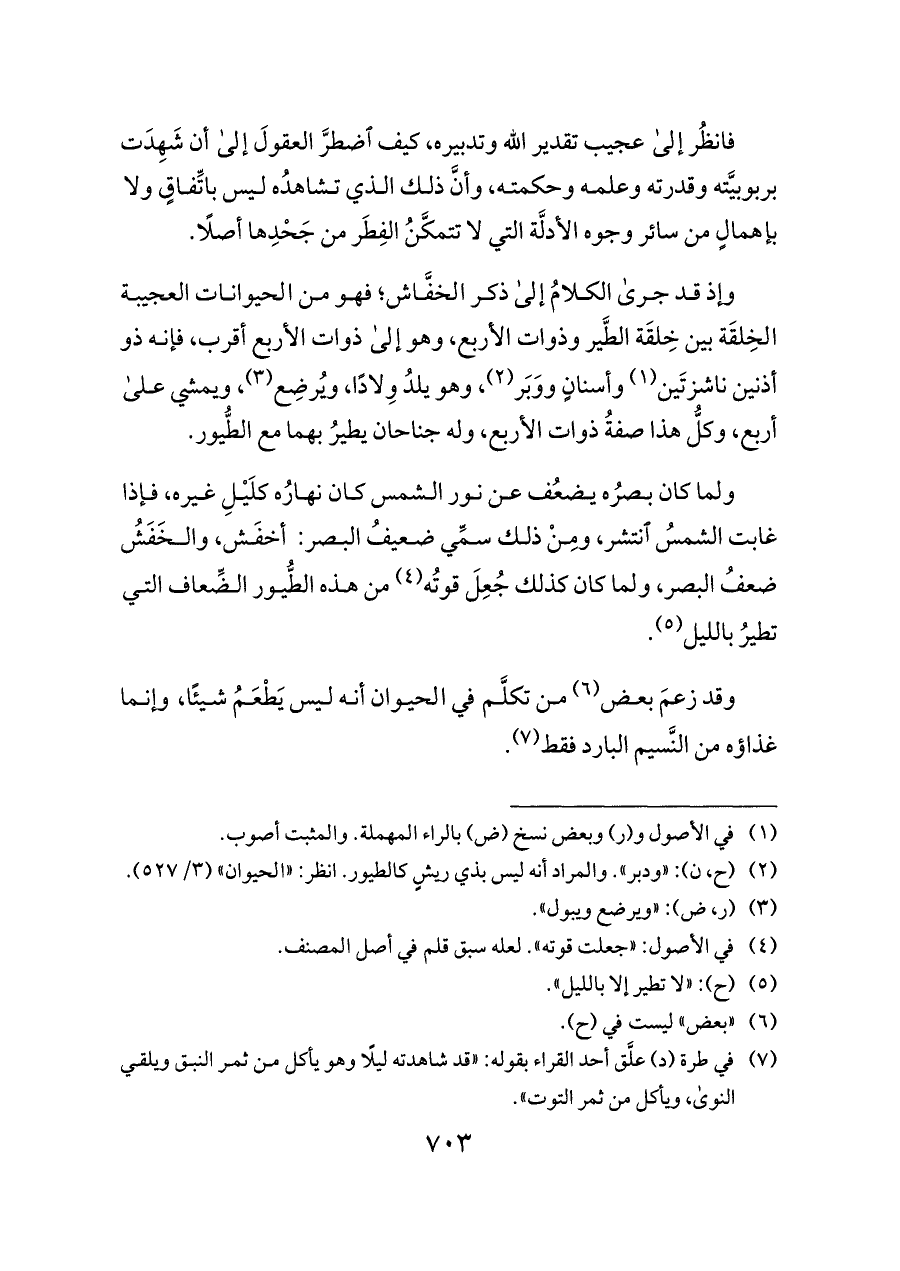 وإذ قد جرى الكلامُ إلى ذكر الخفَّاش؛ فهو من الحيوانات العجيبة الخِلقَة بين خِلقَة الطَّير وذوات الأربع، وهو إلى ذوات الأربع أقرب، فإنه ذو أذنين ناشزتَين (¬١) وأسنانٍ ووَبَر (¬٢)، وهو يلدُ وِلادًا، ويُرضِع (¬٣)، ويمشي على أربع، وكلُّ هذا صفةُ ذوات الأربع، وله جناحان يطيرُ بهما مع الطُّيور.