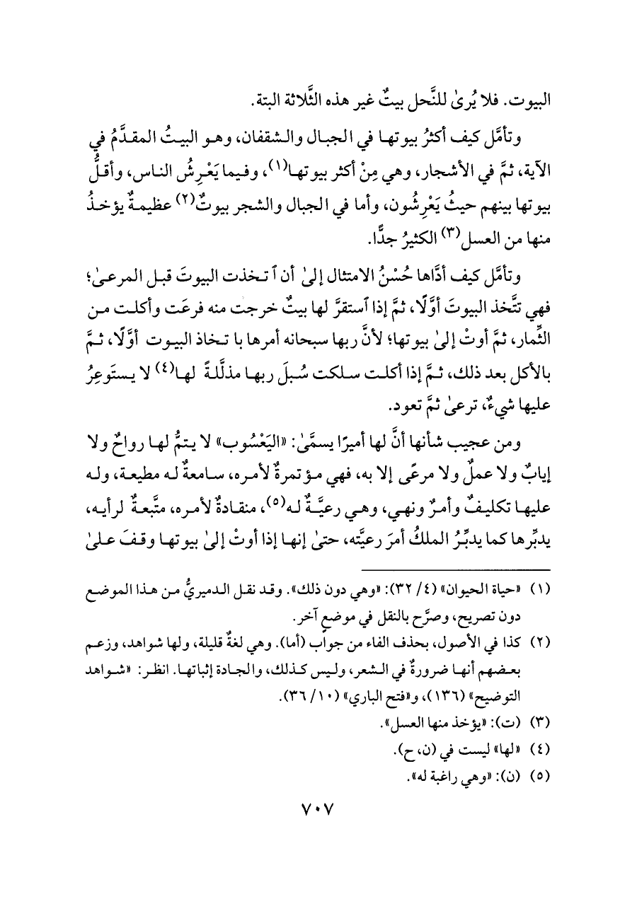 ومن عجيب شأنها أنَّ لها أميرًا يسمَّى: «اليَعْسُوب» لا يتمُّ لها رواحٌ ولا إيابٌ ولا عملٌ ولا مرعًى إلا به، فهي مؤتمرةٌ لأمره، سامعةٌ له مطيعة، وله عليها تكليفٌ وأمرٌ ونهي، وهي رعيَّةٌ له (¬٥)، منقادةٌ لأمره، متَّبعةٌ لرأيه، يدبِّرها كما يدبِّرُ الملكُ أمرَ رعيَّته، حتى إنها إذا أوتْ إلى بيوتها وقفَ على