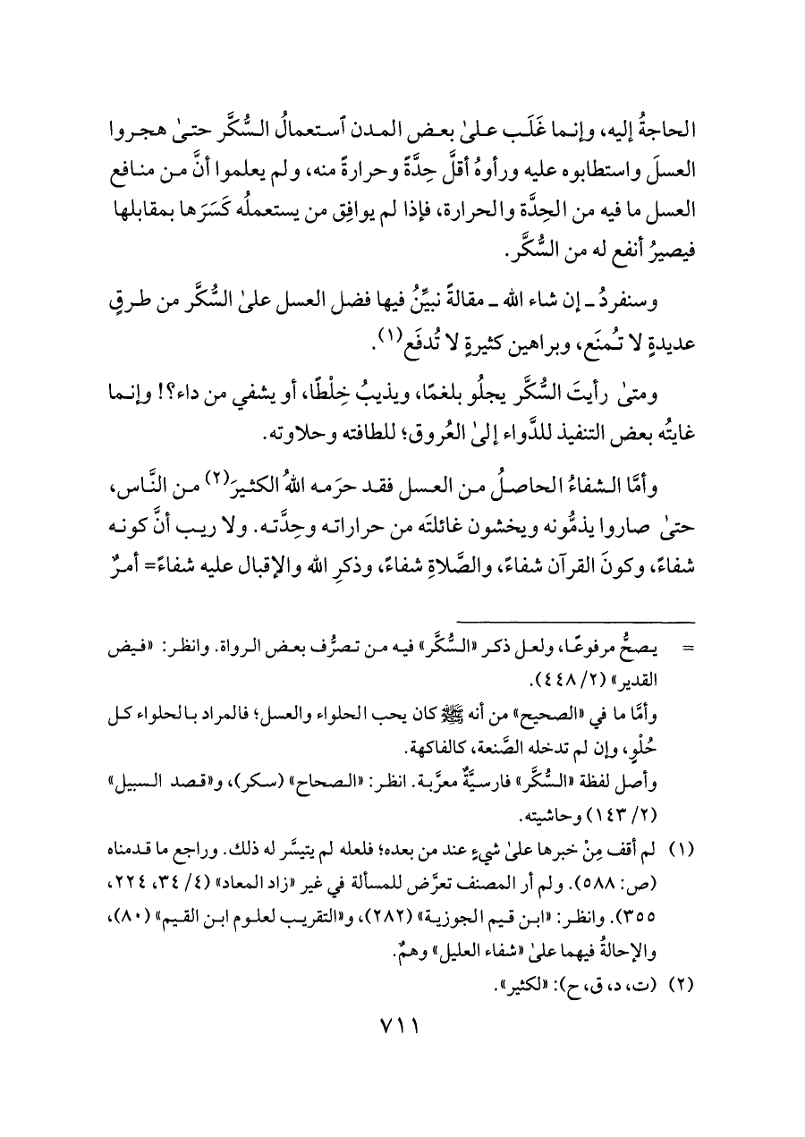وسنفردُ ــ إن شاء الله ــ مقالةً نبيِّنُ فيها فضل العسل على السُّكَّر من طرقٍ عديدةٍ لا تُمنَع، وبراهين كثيرةٍ لا تُدفَع (¬١).