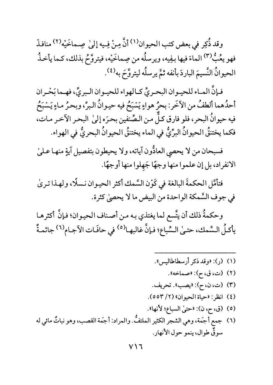فتأمَّل الحكمةَ البالغة في كَوْن السَّمك أكثر الحيوان نسلًا، ولهذا ترى في جوف السَّمكة الواحدة من البيض ما لا يحصى كثرة.