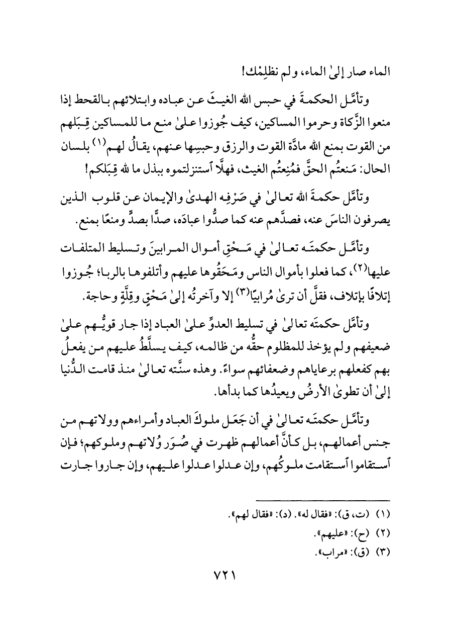 وتأمَّل حكمتَه تعالى في تسليط العدوِّ على العباد إذا جار قويُّهم على ضعيفهم ولم يؤخذ للمظلوم حقُّه من ظالمه، كيف يسلَّطُ عليهم من يفعلُ بهم كفعلهم برعاياهم وضعفائهم سواءً. وهذه سنَّته تعالى منذ قامت الدُّنيا إلى أن تطوى الأرضُ ويعيدُها كما بدأها.