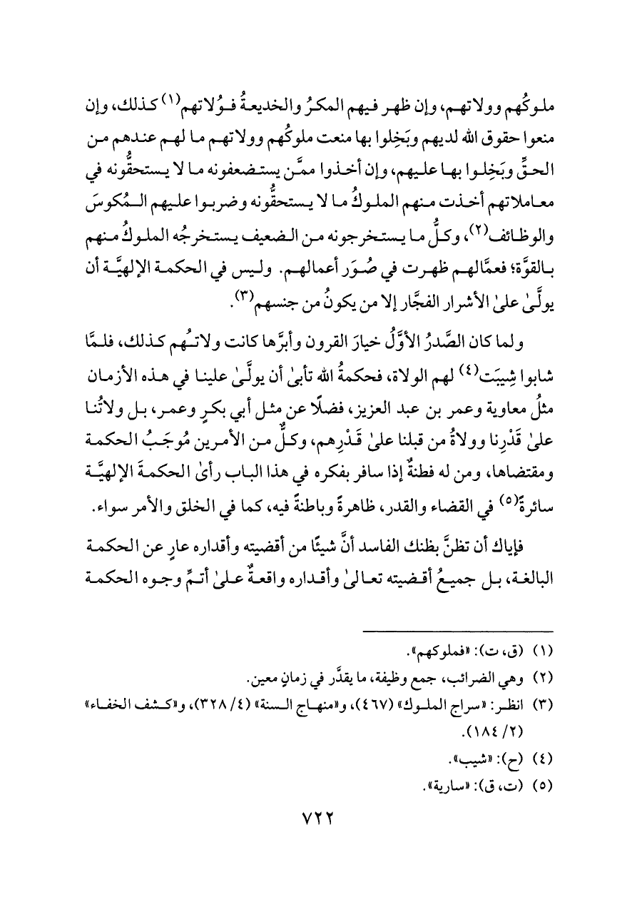 ولما كان الصَّدرُ الأوَّلُ خيارَ القرون وأبرَّها كانت ولاتُهم كذلك، فلمَّا شابوا شِيبَت (¬٤) لهم الولاة، فحكمةُ الله تأبى أن يولَّى علينا في هذه الأزمان مثلُ معاوية وعمر بن عبد العزيز، فضلًا عن مثل أبي بكرٍ وعمر، بل ولاتُنا على قَدْرِنا وولاةُ من قبلنا على قَدْرِهم، وكلٌّ من الأمرين مُوجَبُ الحكمة ومقتضاها، ومن له فطنةٌ إذا سافر بفكره في هذا الباب رأى الحكمةَ الإلهيَّة سائرةً (¬٥) في القضاء والقدر، ظاهرةً وباطنةً فيه، كما في الخلق والأمر سواء.