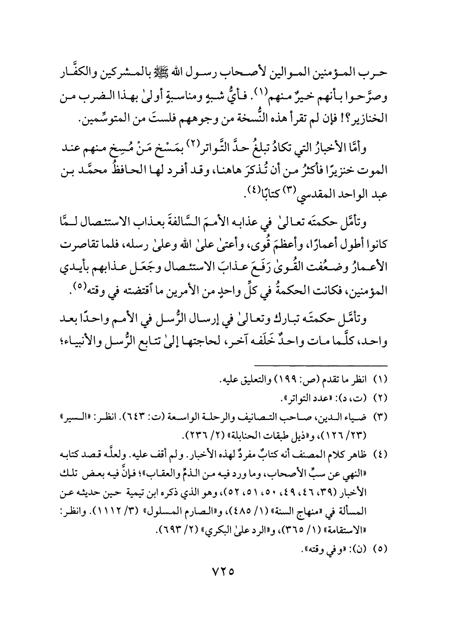 (¬٤) ظاهر كلام المصنف أنه كتابٌ مفردٌ لهذه الأخبار. ولم أقف علاه. ولعلَّه قصد كتابه «النهي عن سبِّ الأصحاب، وما ورد فيه من الذمِّ والعقاب»؛ فإنَّ فيه بعض تلك الأخبار (٣٩، ٤٦، ٤٩، ٥٠، ٥١، ٥٢)، وهو الذي ذكره ابن تيمية حين حديثه عن المسألة في «منهاج السنة» (١/ ٤٨٥)، و «الصارم المسلول» (٣/ ١١١٢). وانظر: «الاستقامة» (١/ ٣٦٥)، و «الرد على البكري» (٢/ ٦٩٣).