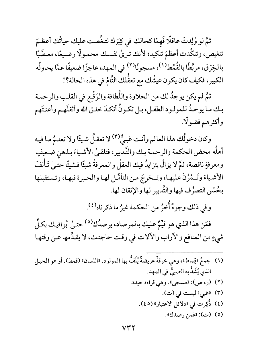 ثمَّ لم يكن يوجدُ لك من الحلاوة واللَّطافة والوَقْع في القلب والرحمة بك ما يوجدُ للمولود الطفل، بل تكونُ أنكدَ خلق الله وأثقلَهم وأعنتَهم وأكثرهم فضولًا.