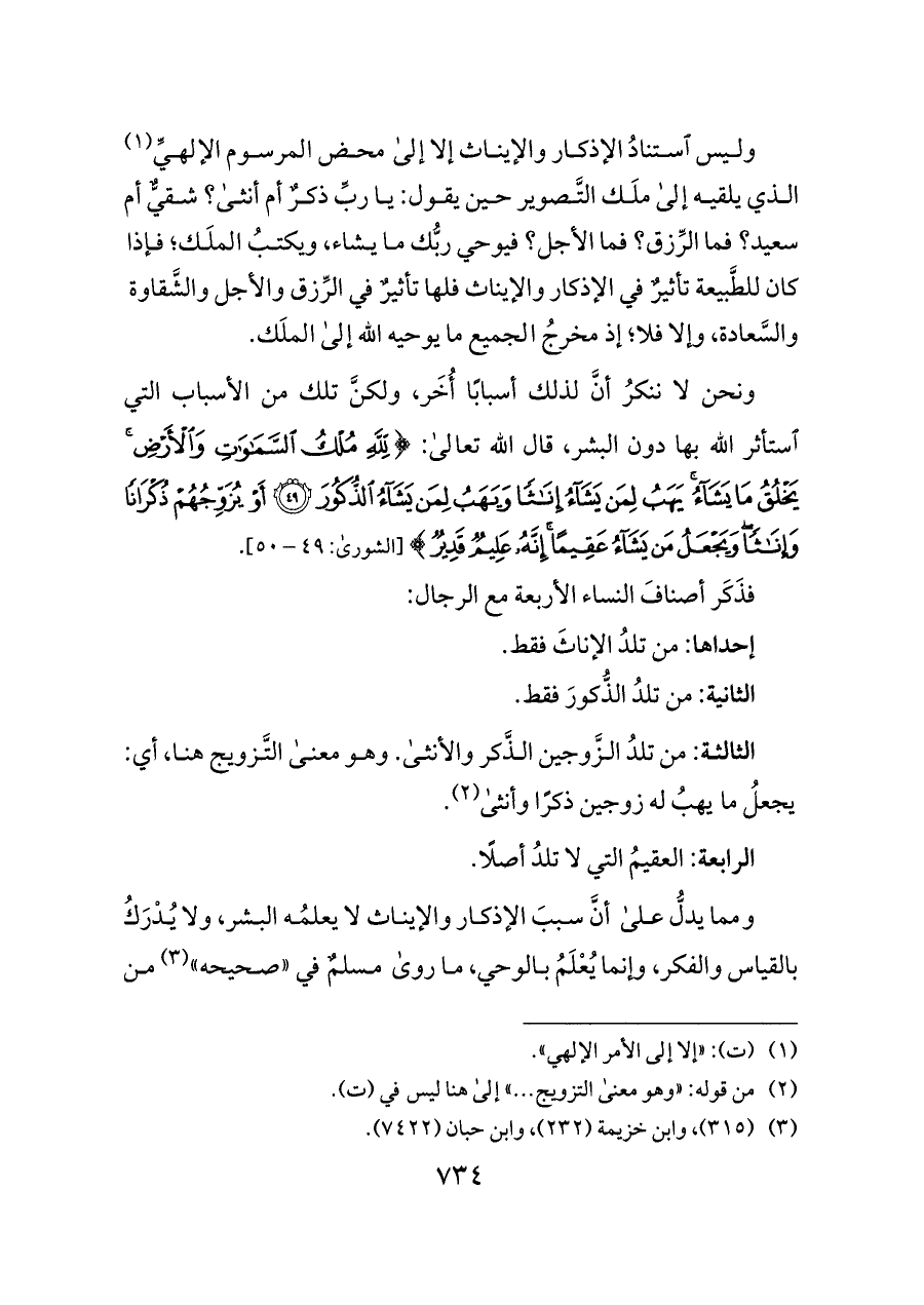 وليس استنادُ الإذكار والإيناث إلا إلى محض المرسوم الإلهيِّ (¬١) الذي يلقيه إلى ملَك التَّصوير حين يقول: يا ربِّ ذكرٌ أم أنثى؟ شقيٌّ أم سعيد؟ فما الرِّزق؟ فما الأجل؟ فيوحي ربُّك ما يشاء، ويكتبُ الملَك؛ فإذا كان للطَّبيعة تأثيرٌ في الإذكار والإيناث فلها تأثيرٌ في الرِّزق والأجل والشَّقاوة والسَّعادة، وإلا فلا؛ إذ مخرجُ الجميع ما يوحيه الله إلى الملَك.