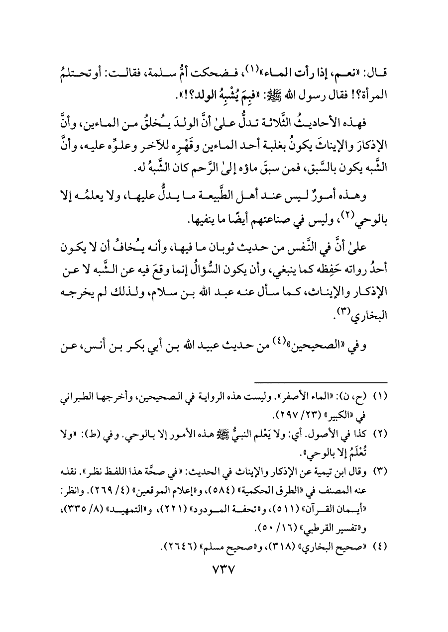 فهذه الأحاديثُ الثَّلاثة تدلُّ على أنَّ الولدَ يُخلقُ من الماءين، وأنَّ الإذكارَ والإيناثَ يكونُ بغلبة أحد الماءين وقَهْرِه للآخر وعلوِّه عليه، وأنَّ الشَّبه يكون بالسَّبق، فمن سبقَ ماؤه إلى الرَّحم كان الشَّبهُ له.