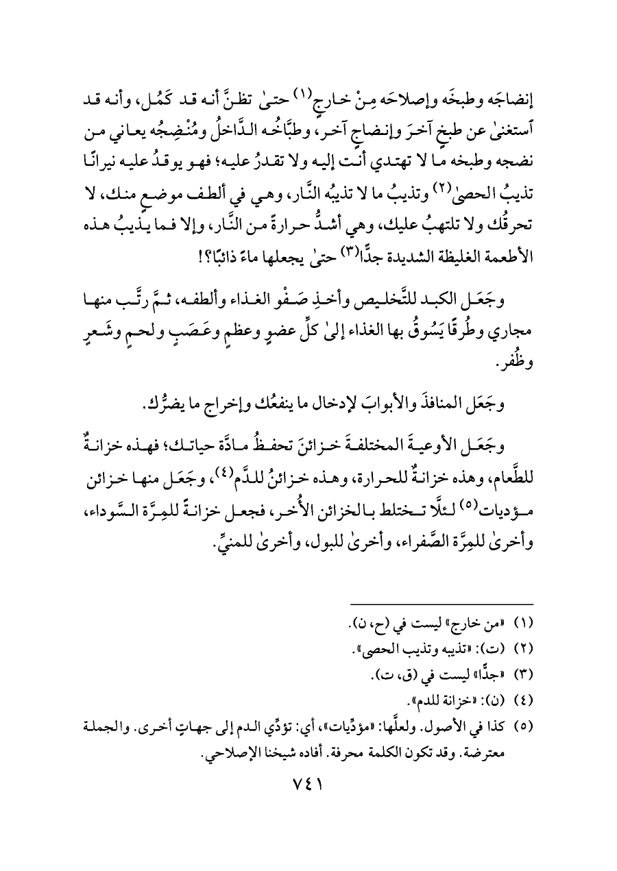 وجَعَل الكبد للتَّخليص وأخذِ صَفْو الغذاء وألطفه، ثمَّ رتَّب منها مجاري وطُرقًا يَسُوقُ بها الغذاء إلى كلِّ عضوٍ وعظمٍ وعَصَبٍ ولحمٍ وشَعرٍ وظُفر.