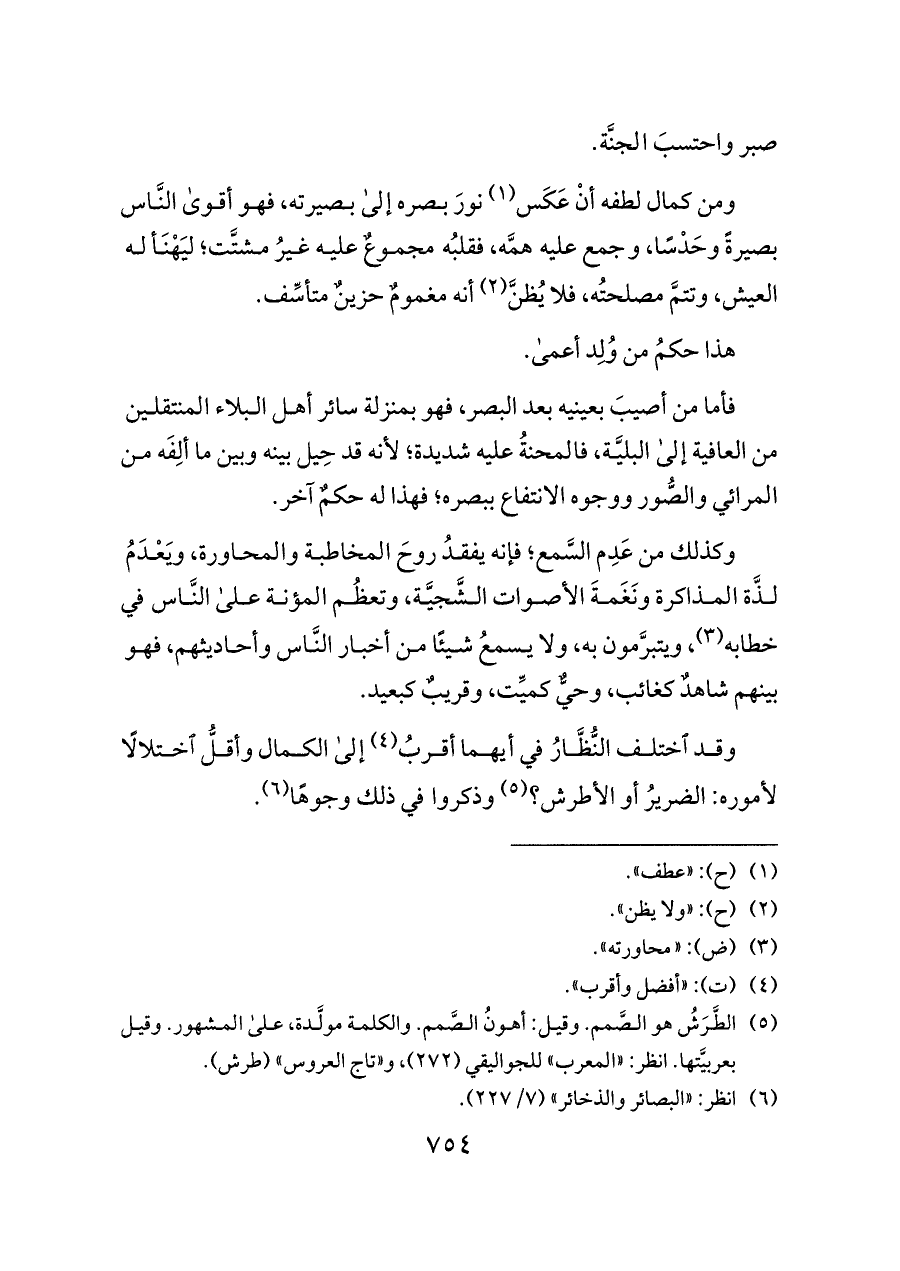 وقد اختلف النُّظَّارُ في أيهما أقربُ (¬٤) إلى الكمال وأقلُّ اختلالًا لأموره: الضريرُ أو الأطرش؟ (¬٥) وذكروا في ذلك وجوهًا (¬٦).