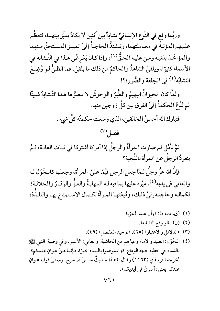 فإنَّ الله عزَّ وجلَّ لمَّا جعل الرجل قيِّمًا على المرأة، وجعلها كالخَوَل له والعاني في يديه (¬٤)، ميَّزه عليها بما فيه له المهابةُ والعزُّ والوقارُ والجلالة؛ لكماله وحاجته إلى ذلك، ومُنِعَتها المرأةُ لكمال الاستمتاع بها والتلذُّذ؛